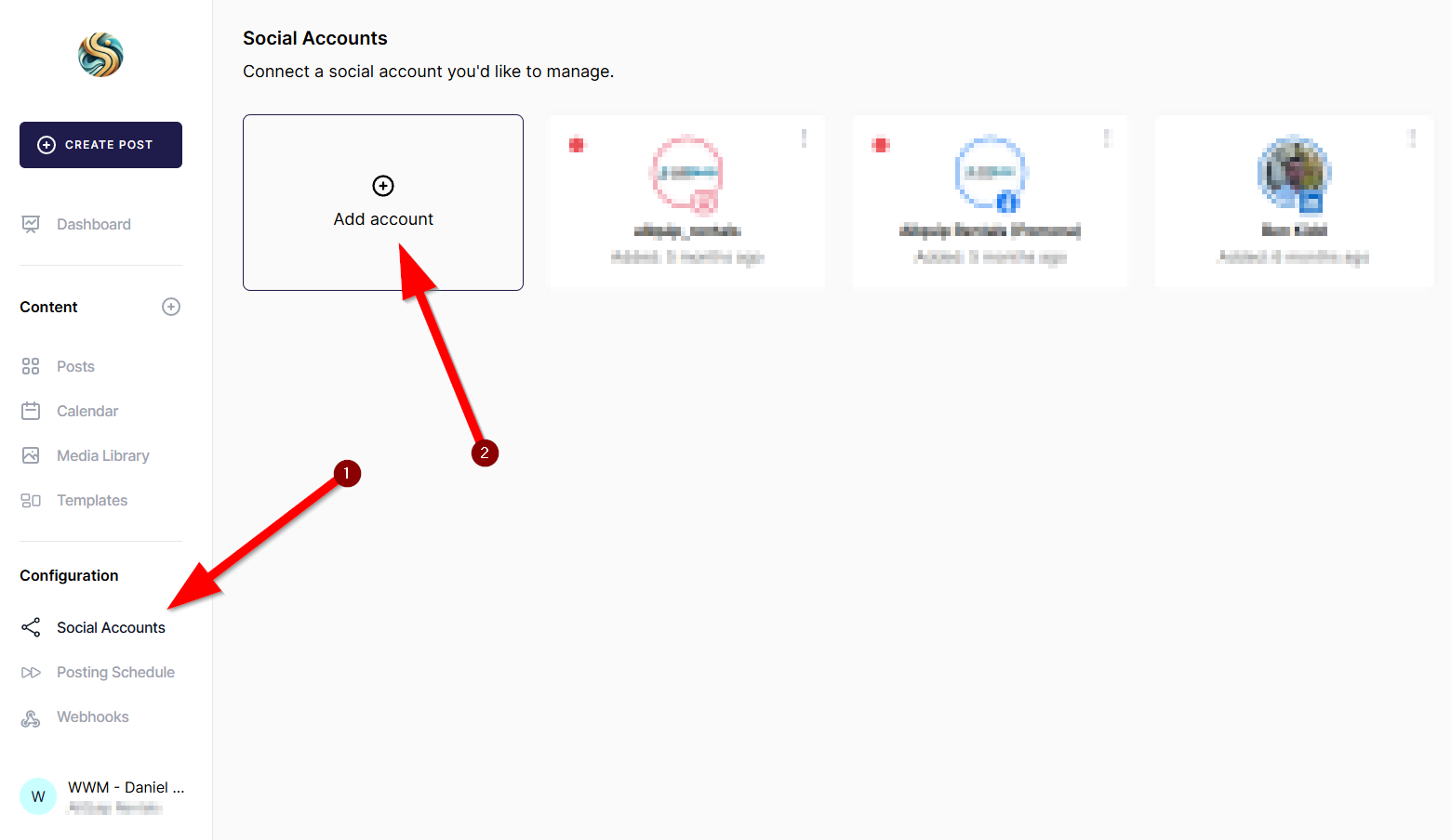 You'll see an "Add account" button in the main area. This is your gateway to connecting all your social media platforms to the dashboard.